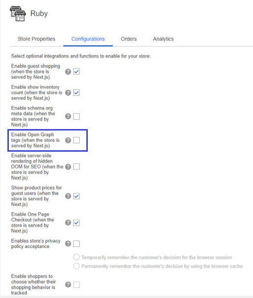 Open Graph tags function is enabled for the user in the Next.js store. - Click the Save button.