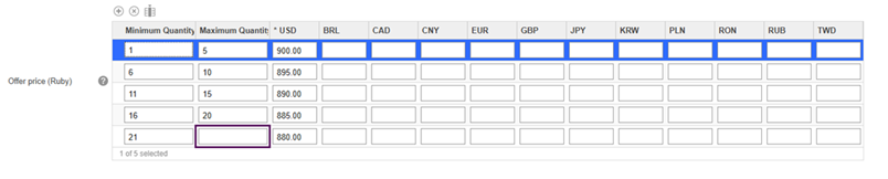 Note: In the last row, leave the Maximum Quantity field empty to allow the user to enter any quantity.