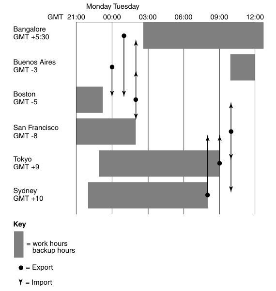 For example, at the Boston site, the VOB /vobs/dev is linked to administrative VOB /vobs/admin, and both VOBs are replicated to San Francisco and Bangalore. You export update packets to replicas sanfran_hub@/vobs/dev and sanfran_hub@/vobs/admin at 11:00 p.m. local time and export update packets to replicas bangalore@/vobs/dev and bangalore@/vobs/admin at 5:00 a.m. local time. The administrator at San Francisco imports both packets at the same time, as does the administrator at Bangalore.