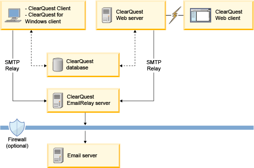 The HCL Compass client and the HCL Compass Web server communicate with the email server using SMTP Relay. The HCL Compass Web client communicates to the HCL Compass Web server through a browser. The HCL Compass EmailRelay sever communicates through the optional firewall to the email server.