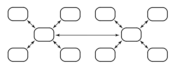 In the hub patterns (Figure 1 and Figure 2), the hub replicas exchange packets with all spoke replicas. In the tree pattern (Figure 3), the root replicas exchange packets with branch replicas.