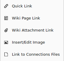 The conn-insert placeholder provides a list of location specific insert options. For example: Within a community, the Link to Connections Files is shown. This placeholder is normally used as part of a custom insert menu.