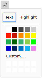 Shows the font color options. For TinyMCE this is displayed as two items, one for the text color and one for highlight color. For Textbox.io this is a single widget that allows setting both. Note that the color list is configurable. |