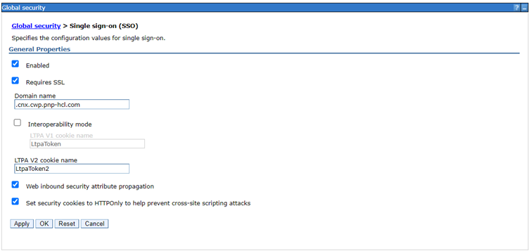 5. Configure Global Security Custom Properties by clicking Security > Global security > Custom Properties and setting these properties to the following values: