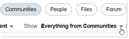 • When you select the Communities filter, you see an additional drop-down filter, Everything from Communities. If you want to limit your results to a list of the communities relevant to your search term, select Communities from the drop-down. If you want results that return relevant content within the communities, select Content in Communities.