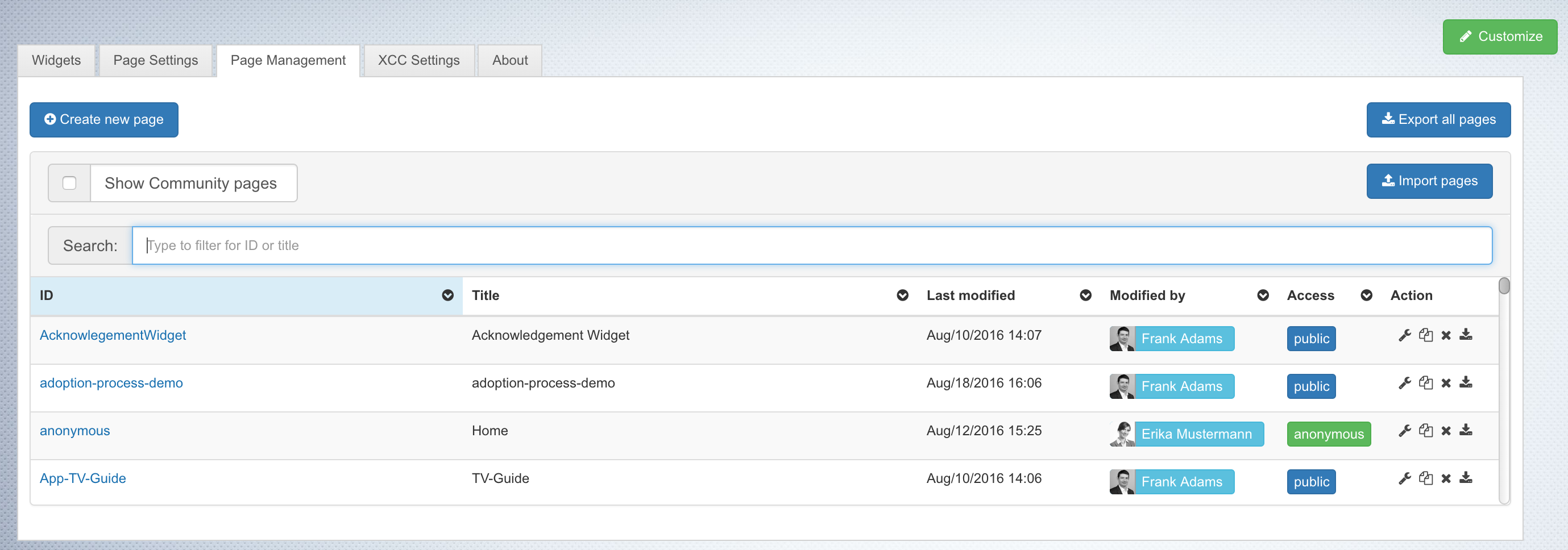 - In your new environment, go to the Page-Management tab and click Import pages.