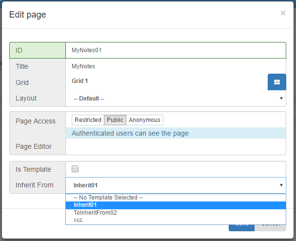 After you have added content to your Connections Engagement Center template, you can select the Connections Engagement Center pages, which will inherit from your template. To do this, go to the Page Management and edit every page you want to let inherit from your template. In the edit page modal box of the Connections Engagement Center page that will inherit, you select your template in the dropdown with the label Inherit from and click on Save. You have to do it for every page that shall inherit.