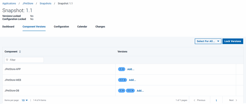 The JPetStore-DB component uses incremental versions and must contain both the 1.0 and 1.1 versions to deploy. If the JPetStore-DB component does not contain both versions, you must update the component version. See Configuring the server and target system.