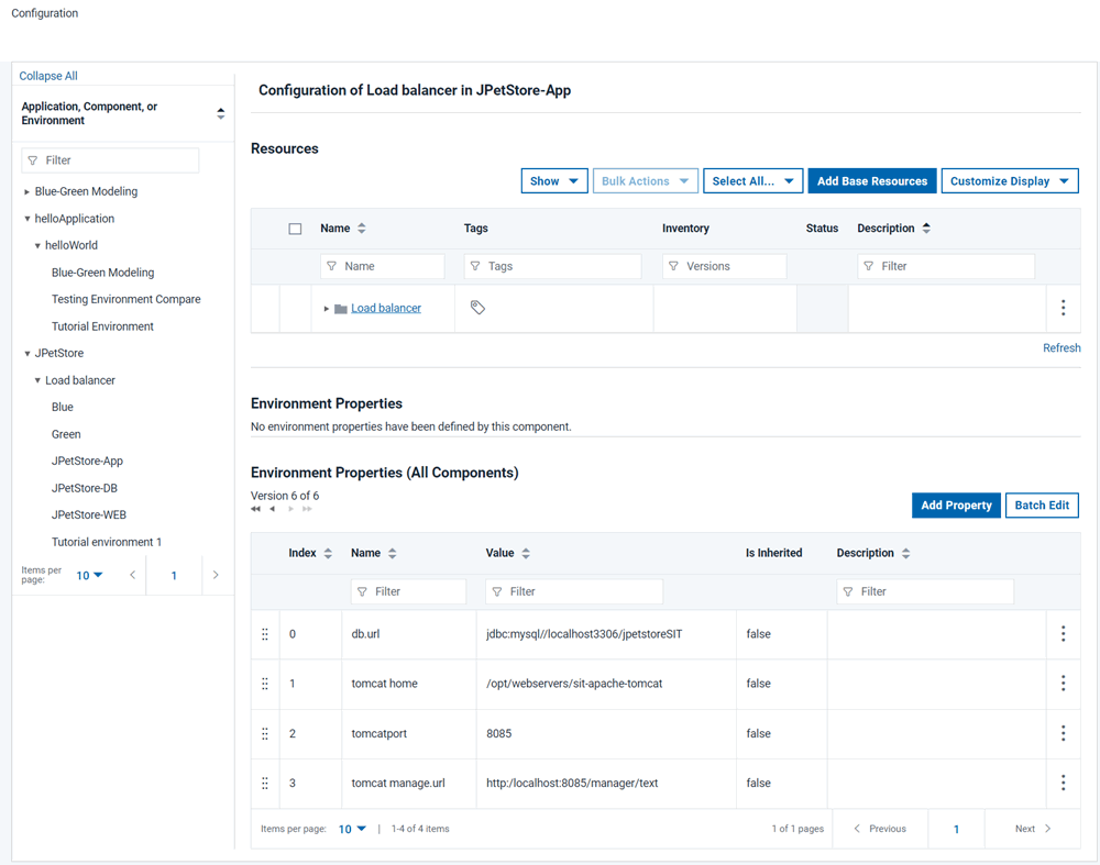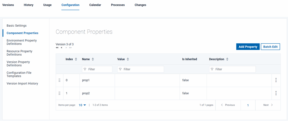 Access the Configuration page by clicking the Configuration tab. From this page, you can add properties to applications, components, and environments.
