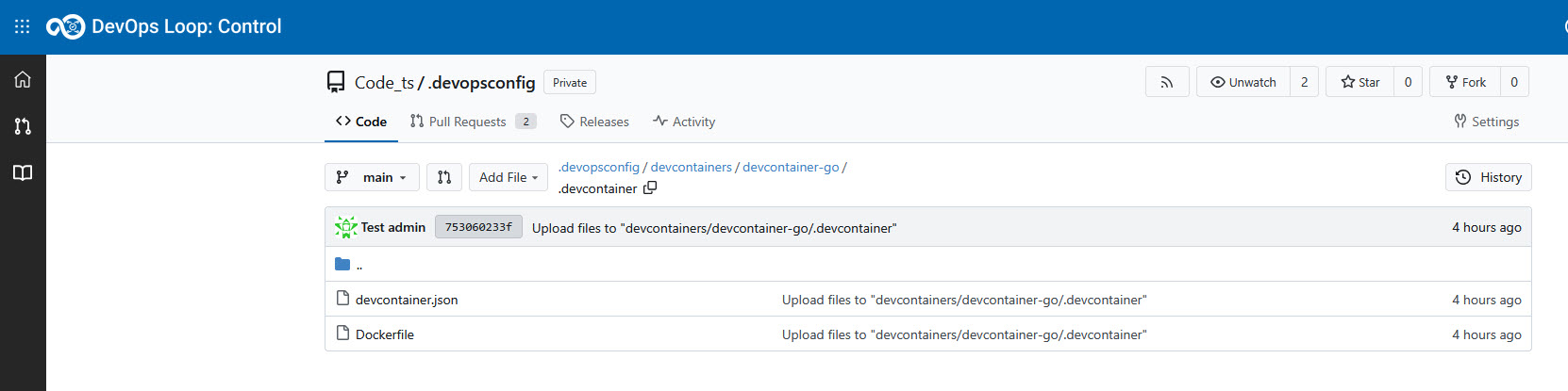 - Go to the Control page. You’ll see a repository named .devopsconfig under your teamspace (e.g., TeamspaceEG/.devopsconfig).