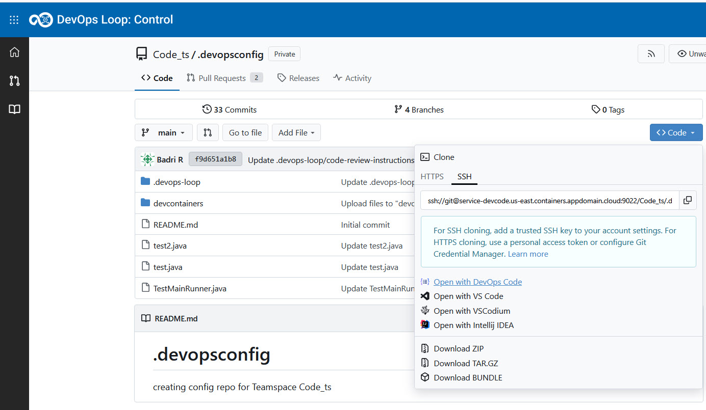 After navigating to the Control page and locating the .devopsconfig repository, you can update your configuration files using the recommended workflow