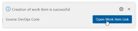 A prompt is displayed at the end of the IDE to indicate that the work item has been created successfully.