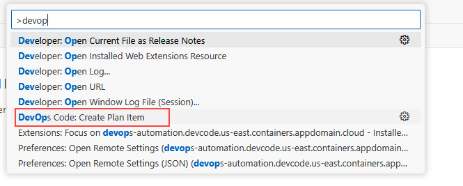 The DevOps Code extension allows integration with HCL DevOps Plan (Plan), enabling you to create and manage work items directly from your development environment in the browser IDE.