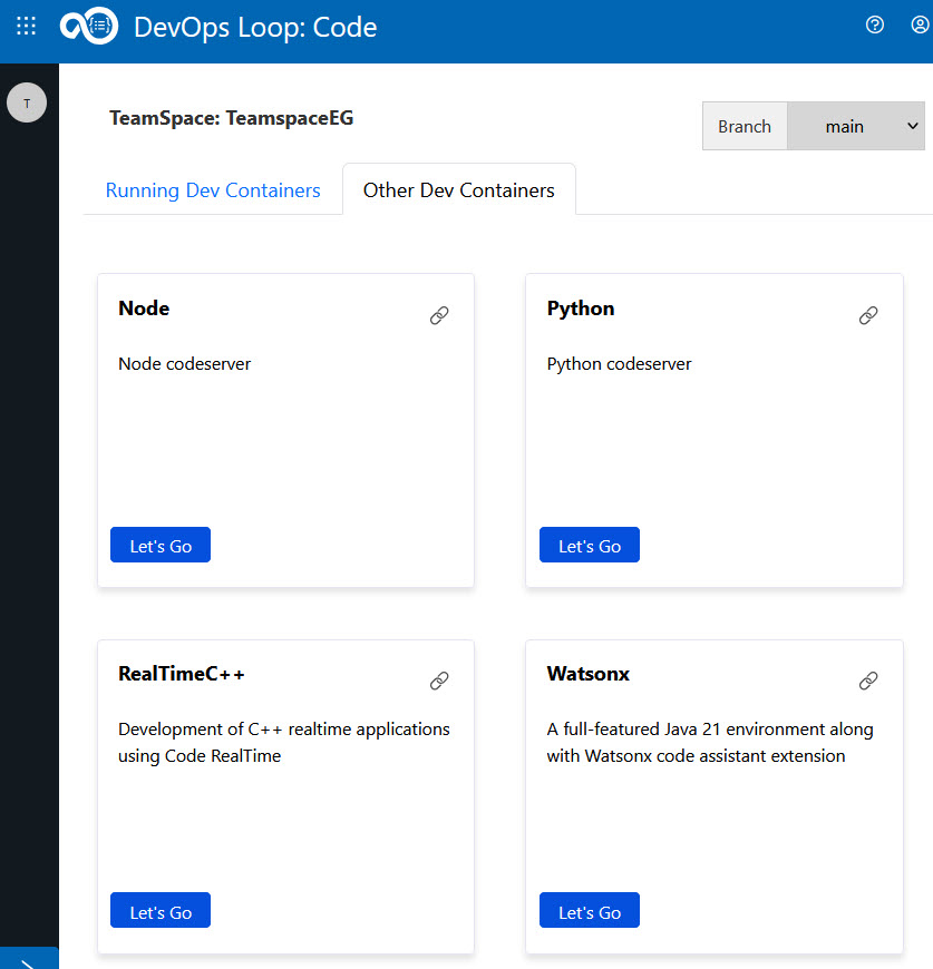 To launch the Starter container, go to the Code landing page and click the Let’s Go button on the Starter container tile. Alternatively, to copy a direct link to the container, click the copy link button on the tile. You can then paste the link into a web browser address bar to open the container.