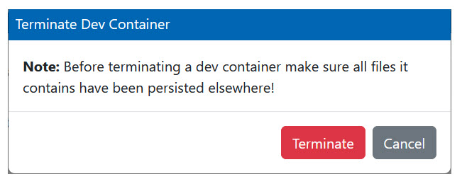 When a dev container starts running, you can see a Terminate button on the dev container tile. This action opens the Terminate Dev Container dialog.
