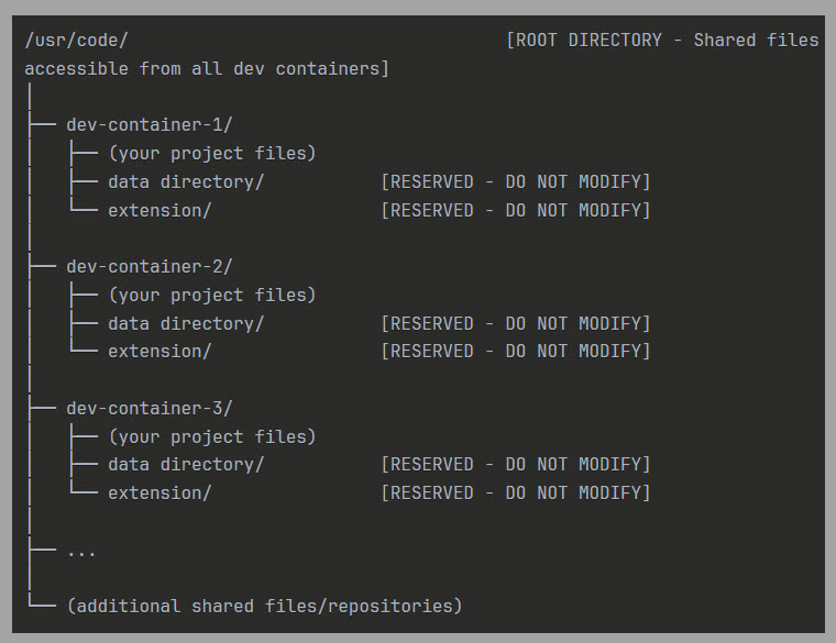 - extension: Contains system-managed extension filesNote:You must not modify these directories as changes may cause your dev container to malfunction.