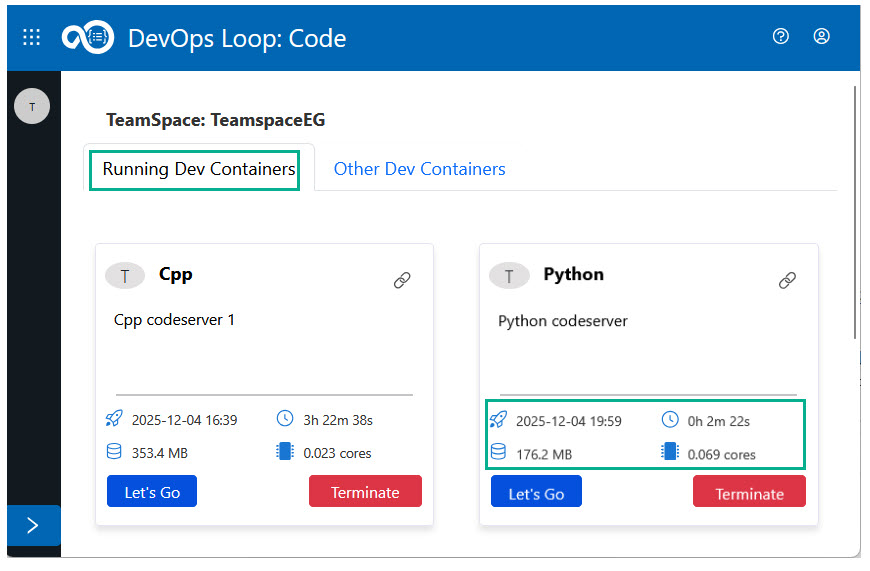 To optimize performance, Code provides real-time visibility into the resource metrics of your dev containers, such as: