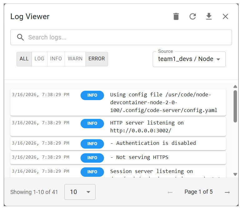 Log Viewer opens as a panel within the Code interface. You access it from the help menu in the top-right corner of the page. Once open, you can switch between Code logs and dev container logs using the Source dropdown, apply severity filters, search log entries by keyword, and download captured logs as a file. The Log Viewer captures trace logs from your running dev containers and from Code itself. It does not capture output from applications that run inside the dev containers, for example, the output of a Node.js application.