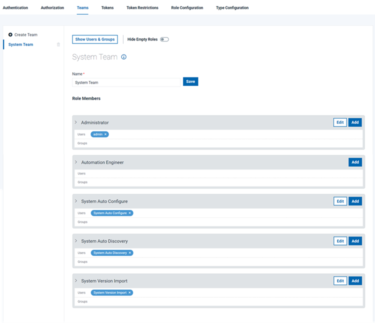 When a team is selected, all previously defined roles are available. In the following figure, the System Team is selected. All roles are displayed, and users are listed below their assigned roles. Users and groups are added to a team by assigning them to a specific role or roles.