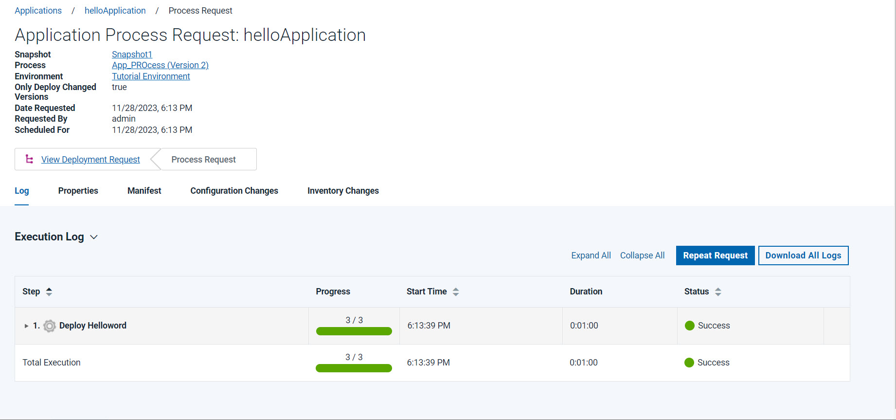 It repeats the same deployment that was previously requested, including the selected versions. Repeating a previous deployment might result in receiving an Already Installed message. When an application process step completes successfully, it is tagged with a version number. If a process does not complete successfully, it remains at the same version. Therefore, starting a repeat request function where some processes completed successfully and which some failed, a mixture of updated versions and remaining versions exist.