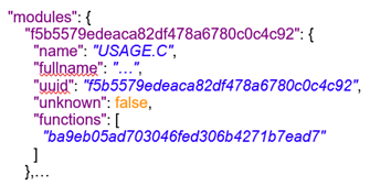 • unknown is set to true is the module is not part of the information you provided (there is only one unknown module that gathers all the function calls that are not in the known modules),
