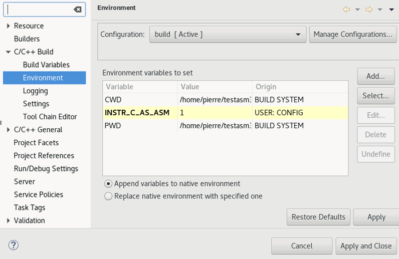 - Click Add, give a name to the variable, and enter INSTR_C_AS_ASM=1 in Value.