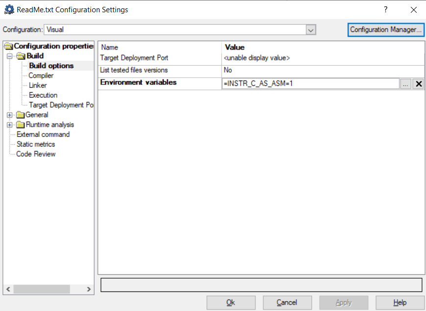 • Click the Add icon, give a name to the variable, and enter INSTR_C_AS_ASM=1 in Value.