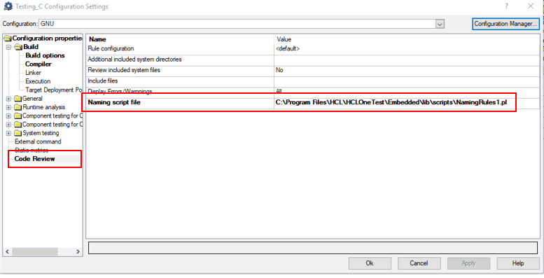 In HCL DevOps Test Embedded Studio (Test Embedded Studio), you can edit and customize a Perl Naming script file to check your own naming rules (code custom naming rules U99.1). You must set the path to this customized naming script file in the code review settings to check your naming rules.