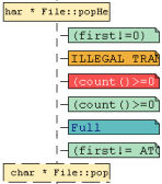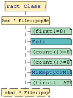 The following example shows how a typical class contract is represented by Component Testing for C++. C++ classes are represented as vertical lines, like object instances. The events related to the class - method entry and exit, assertion and state chart checks - are attached to the class lifeline.