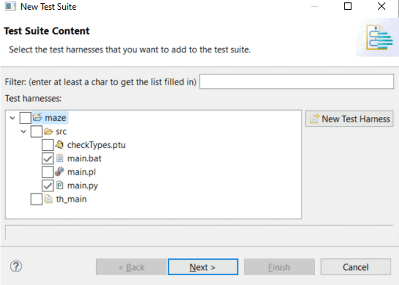 The Test Suite Content wizard automatically displays all the files that are available in your project and that can be run with the selected test harnesses: main test configuration files for test harnesses, .ptu files for PTU test scripts, .otd files for OTD test scripts, .bat files for Windows scripts, .pl files for Perl scripts, .py files for Python scripts (.py files), or .shell for Linux scripts.
