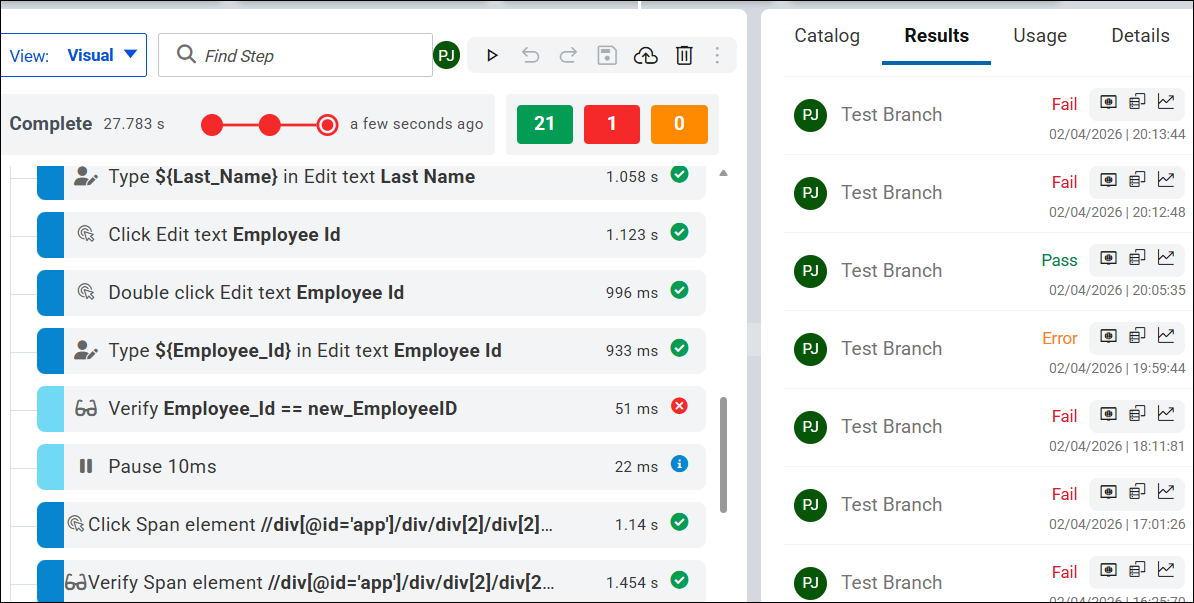 The Functional Report and Test Log help you confirm whether HRM application workflows, such as employee creation and verification, worked as expected and quickly pinpoint the cause of failures. The example used in this task demonstrates a test failure caused by an Employee_Id value mismatch.