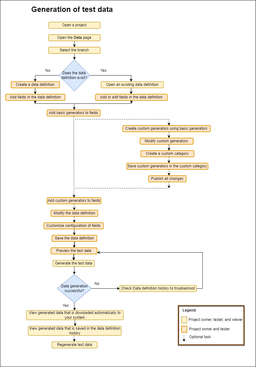 You can use the task flow diagram to get started with the generation of test data by using the data fabrication feature of HCL DevOps Test Hub (Test Hub). The following diagram can help you to visualize the sequence to easily generate the test data.