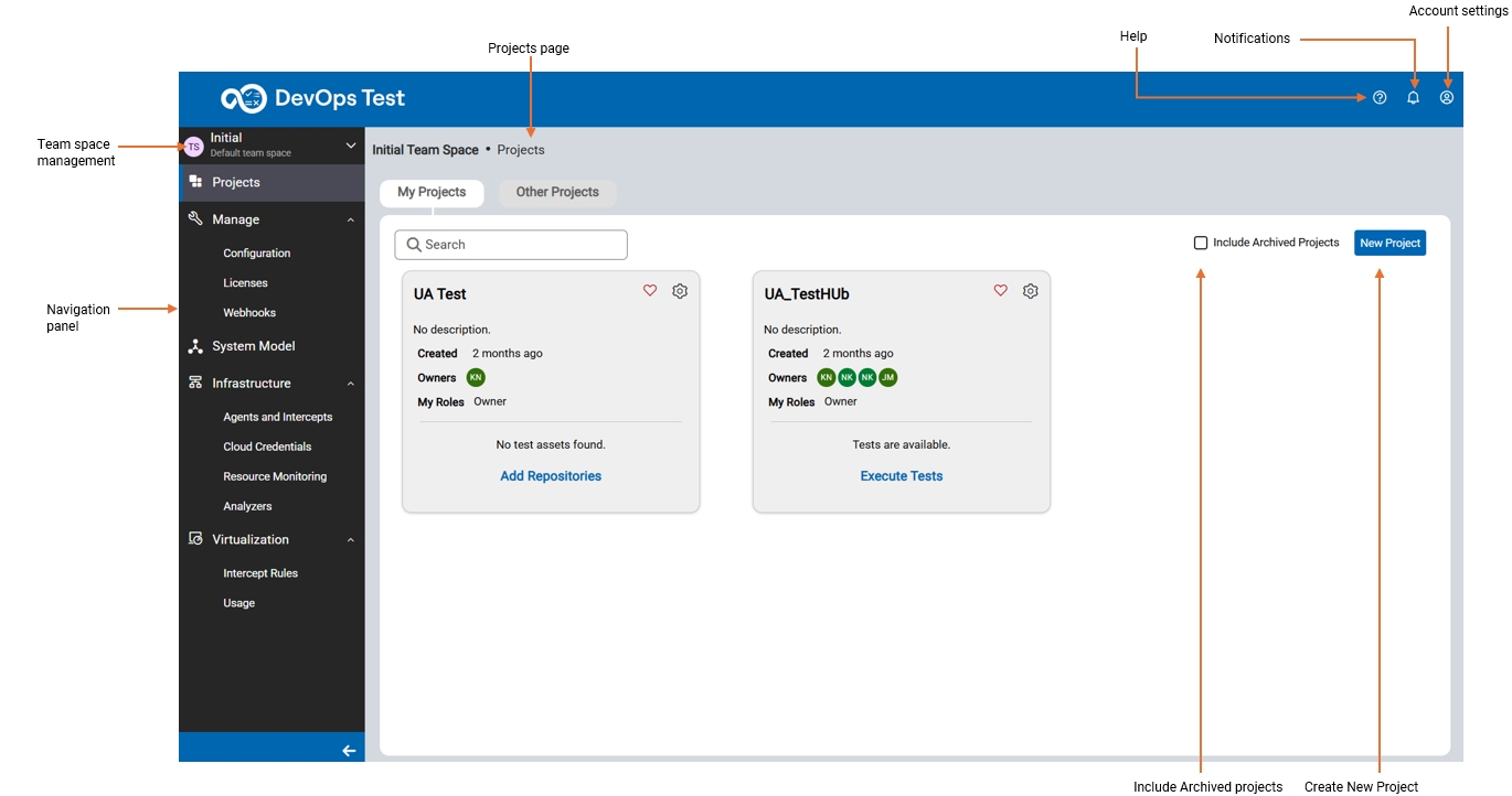The navigation panel in Test Hub provides quick access to sections such as Projects, Manage, System Model, Infrastructure, and Virtualization. You can easily navigate your projects, configure settings, define system models, monitor infrastructure, and manage virtualization. Each section of the dashboard is designed to support you with a specific function, making your testing workflow more efficient and intuitive.