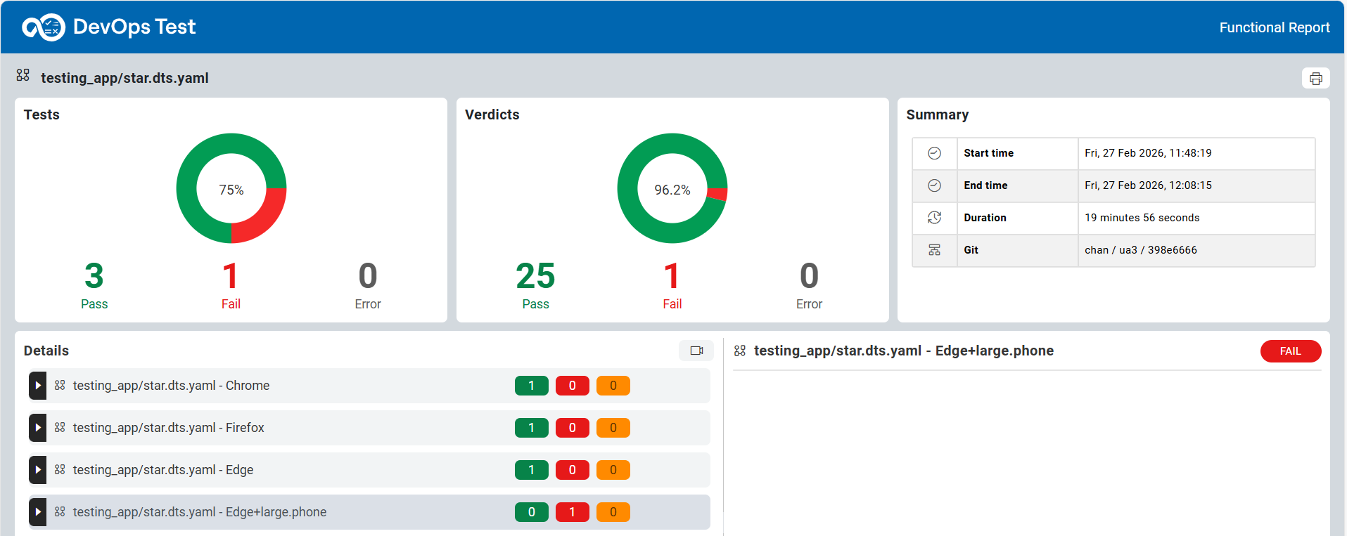 The functional report displays the results of the test run for each configured browser.