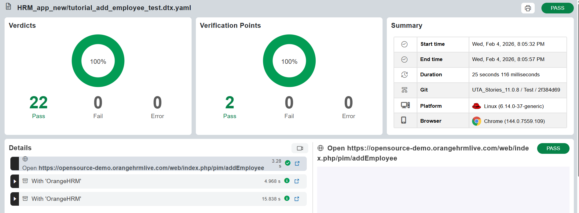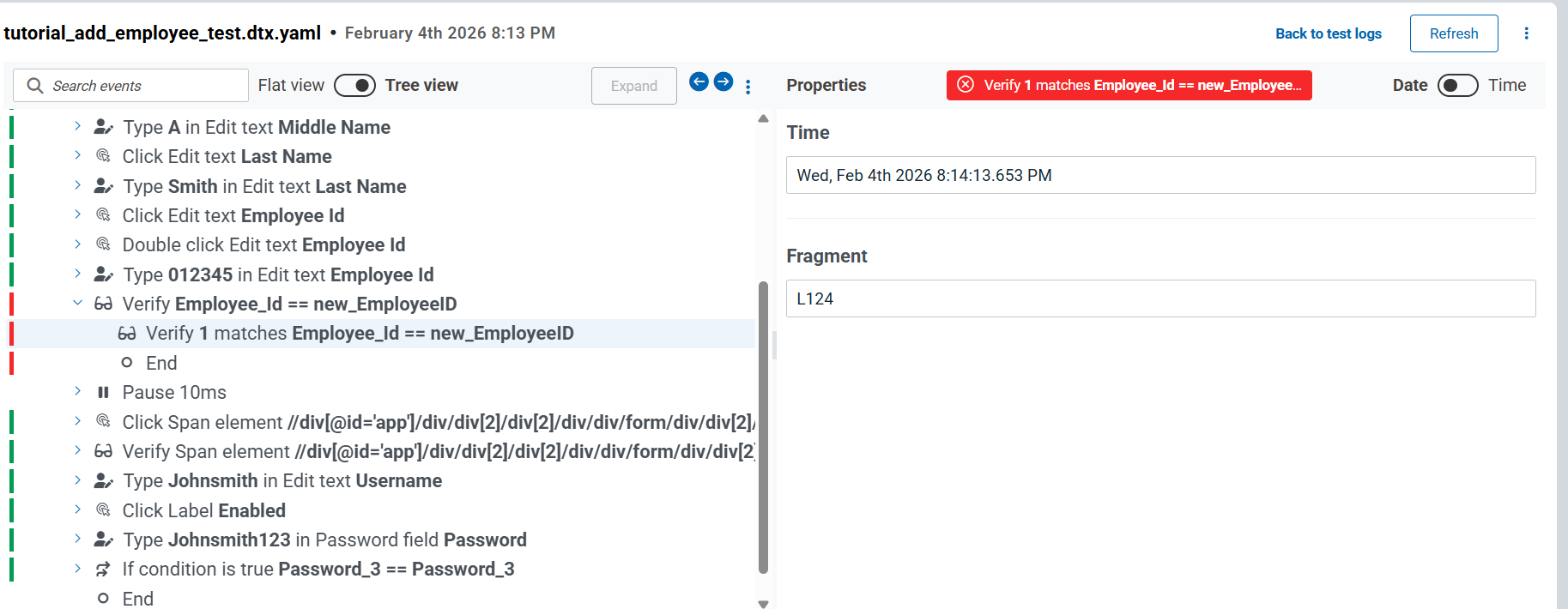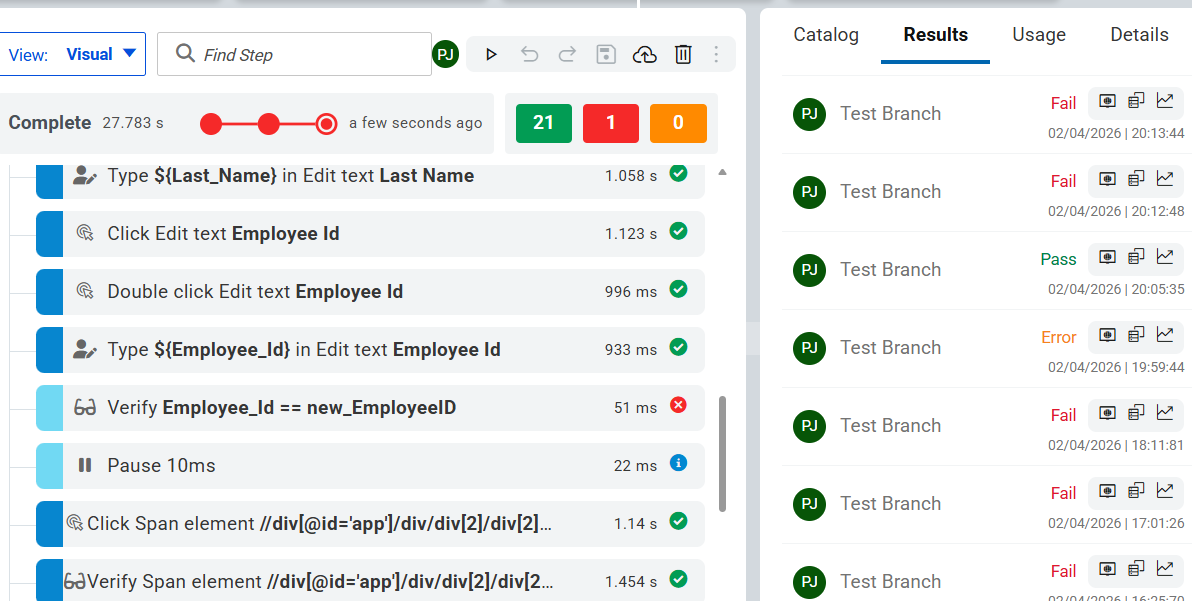 The Functional Report and Test Log help you confirm whether HRM application workflows, such as employee creation and verification, worked as expected and quickly pinpoint the cause of failures. The example used in this task demonstrates a test failure caused by an Employee_Id value mismatch.