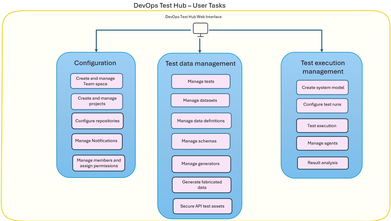 You can perform the following user tasks in Test Hub to support different stages of the testing lifecycle.
