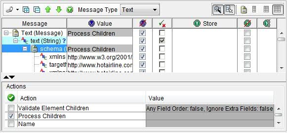 The structure of a message is defined when you are using the publish/subscribe actions. In each action type, different views of the message can be selected. On selecting a view, information relating to the storage and validation of the message is displayed.