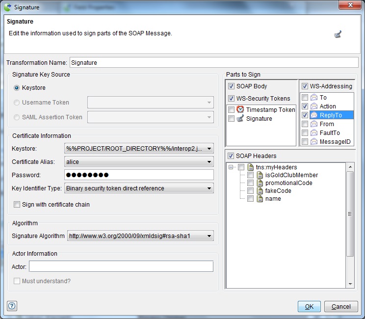 Note: In the Signature window, only message elements that are explicitly selected will be signed.