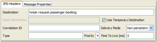 Option Description Destination The destination to which the message is sent. Reply Destination An optional destination to which a message reply is sent. Use Temporary Destination To create and use a temporary destination. Correlation ID An optional ID that can be used to link messages, such as linking a response message to a request message. Delivery Mode The delivery mode to use, Persistent, or Non-persistent. Type The message type identifier. Priority A numerical ranking of the message priority, 0 - 9. Larger numbers represent higher priority. Time to Live (ms) Length of time, in milliseconds that the message lives before it expires. If set to 0, the message does not expire. If the server expiration property is set for a destination, it overrides this value.