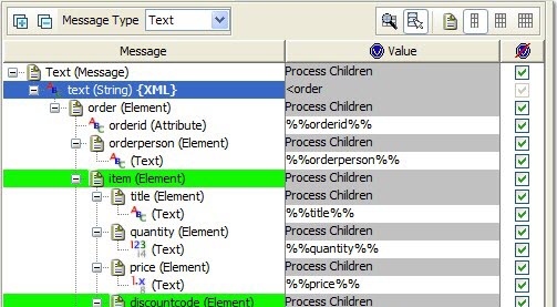 The Publish action contains an XML message to which the schema is applied. The transport that is used for publishing is not important for the example. Each available field in the message is quick tagged. This means, the contents of the field are set to a tag that matches the name of the element. The fields within the data set that contain repeating elements are marked as such.
