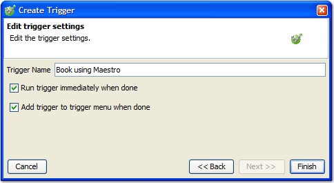 5. Provide a name for the trigger and select whether you want to run the trigger after it is created and whether to add the new trigger to the Triggers menu in the Events View.