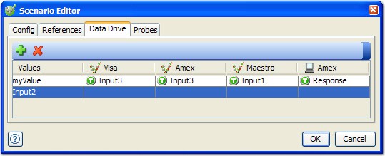 To add an entry to the table, click the icon. A new row is created with a Values column and a column for each test and referenced stub in the scenario. You can paste data into the table by pressing Ctrl + V or by right-clicking an existing row in the table and selecting Paste from the menu. A new row is created with the pasted text as the value. Pasting multiple lines creates multiple rows.