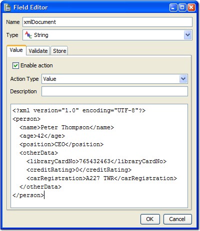 In the following example, a field named xmlDocument of type String is created, and some XML entered in the field editor as its content.