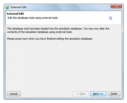 Opening the External Edit wizard and clicking Next loads the currently selected database stub into the simulation database and HCL DevOps Test Integrations and APIs (Test Integrations and APIs) waits for you confirm that you have completed your edits.