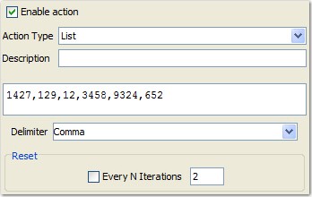 To reset the action and restart from the first value, tick the box under Reset and enter the wanted number of iterations in the field provided.