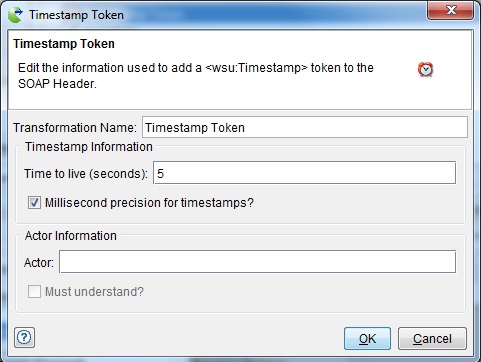 Field Description Transformation Name (Required) User-defined name for the security action (helps identify the action in the main list). Time to live (Required) The amount of time (in seconds) for which the token is valid after you send the message. Millisecond precision for timestamps If enabled, the timestamp for the <wsu:Created> element is generated by using milliseconds (2009-03-31T02:41:16.817Z). If disabled, the timestamp is generated without milliseconds (2009-03-31T02:41:16Z). Actor Indicates a specific message receiver (either the ultimate receiver or an intermediary). For each actor/role that is defined (that is, in multiple tokens), a separate security header is added to the SOAP header. Must understand If enabled, makes the SOAP header mandatory for the specified actor/role. In this case, either the header block must be processed or the entire SOAP message must be ignored, and a SOAP fault must be generated. If not enabled, the specified actor/role may or may not process the SOAP header.