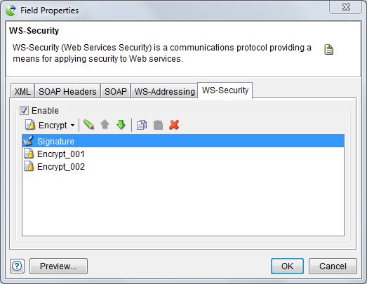 - Open the WS-Security tab. Select the Enable check box, if not done already.