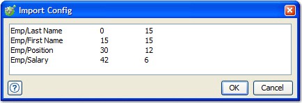 Offset/Width Rules Start Char/End Char Rules Emp/Last Name 0 15 Emp/Last Name 0 15 Emp/First Name 15 30 Emp/First Name 15 30 Emp/Position 30 42 Emp/Position 30 42 Emp/Salary 42 48 Emp/Salary 42 48Note:Start Char/End Char rules are converted to Offset/Width figures when displayed in the data source configuration dialog. - If the fields in your files are padded with extra characters so that they fill their space in the line, select the Trim cell padding option and specify the padding character. This character is removed when data is extracted.