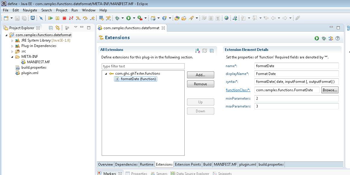 Field Value name The name of the function. For example, formatDate. displayName The name under which the function is displayed in the Functions menu. For example, Format Date. To place the function under a specific submenu, prefix the display name with the name of the submenu and a forward slash / character. For example, Custom/Format Date places the function under a Custom submenu. Any number of submenus is permitted by using the same naming format. syntax The syntax of the function. For example, formatDate(date, inputFormat [, outputFormat])]. functionClass The class that performs the work of the function. This class must be a fully qualified class name that extends from com.ghc.ghTester.expressions.Function. With Eclipse, you can enter the name manually or search for it using the Browse button. minParameters The minimum number of parameters to pass to the function. For example, 2. maxParameters The maximum number of parameters to pass to the function. For example, 3. Entering -1, indicates that there is no maximum and any number of arguments that is greater than or equal to minParameters is accepted.