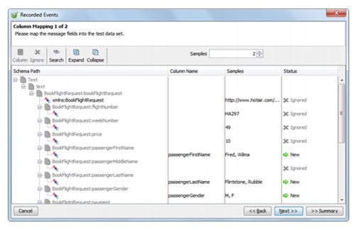 5. On the Column Mapping screen, map the fields in the selected recorded events to the data source that you want to use for data-driven stubbing.
